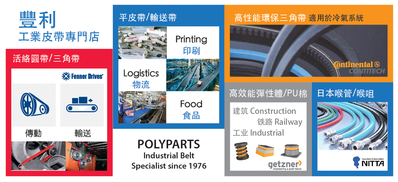 豐利工程貿易有限公司專營傳動及輸送工業產品,成立於1976。工業皮帶產品包括三角帶,坑帶,同步帶,牙齒帶,齒形帶,正時帶,時規帶,輸送帶,運輸帶,開口PU同步帶,模組帶。訂製金屬產品包括:三角帶輪,坑轆,同步帶輪,傳動鏈條,輸送鏈條,鏈輪。