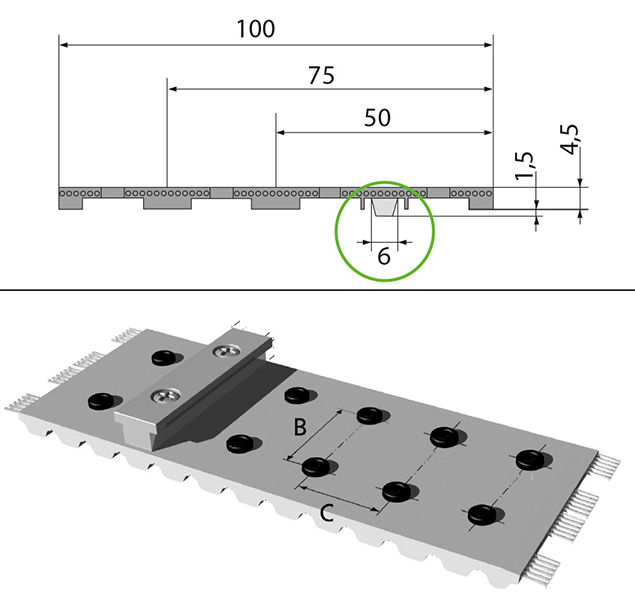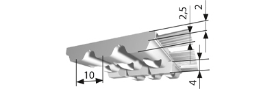| Belt widths b -ATN10K6 | Belt widths b -ATN10K6 DC | V-groove location | B | C min | Number of shapes for inset parts per tooth |