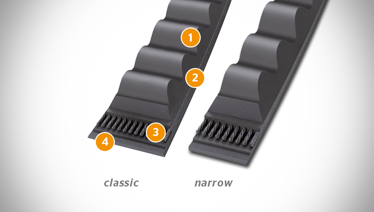 經典切邊三角帶,用於要求嚴苛的傳動裝置; 符合DIN 2215和DIN 7753標準。